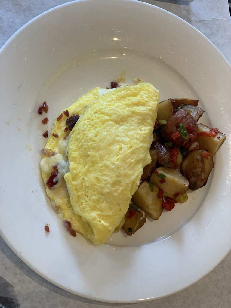 Food: We met up for brunch, and I did not eat; I was hungry and ready to order. The menu reminded me of Dutch and French St. Maarten. The European influences were genuinely present. I ordered the Chorizo Sausage Benedict (homemade biscuit, avocado, smoked paprika hollandaise) and a side of Brioche French Toast (honey mascarpone, banana, fresh strawberries). My two other friends ordered the Four Cheese and Bacon Omelet and Three Eggs Your Way, with a side of the Roasted Red Bliss Potatoes. Overall, my tummy was complete, and my heart was whole. That says it all!