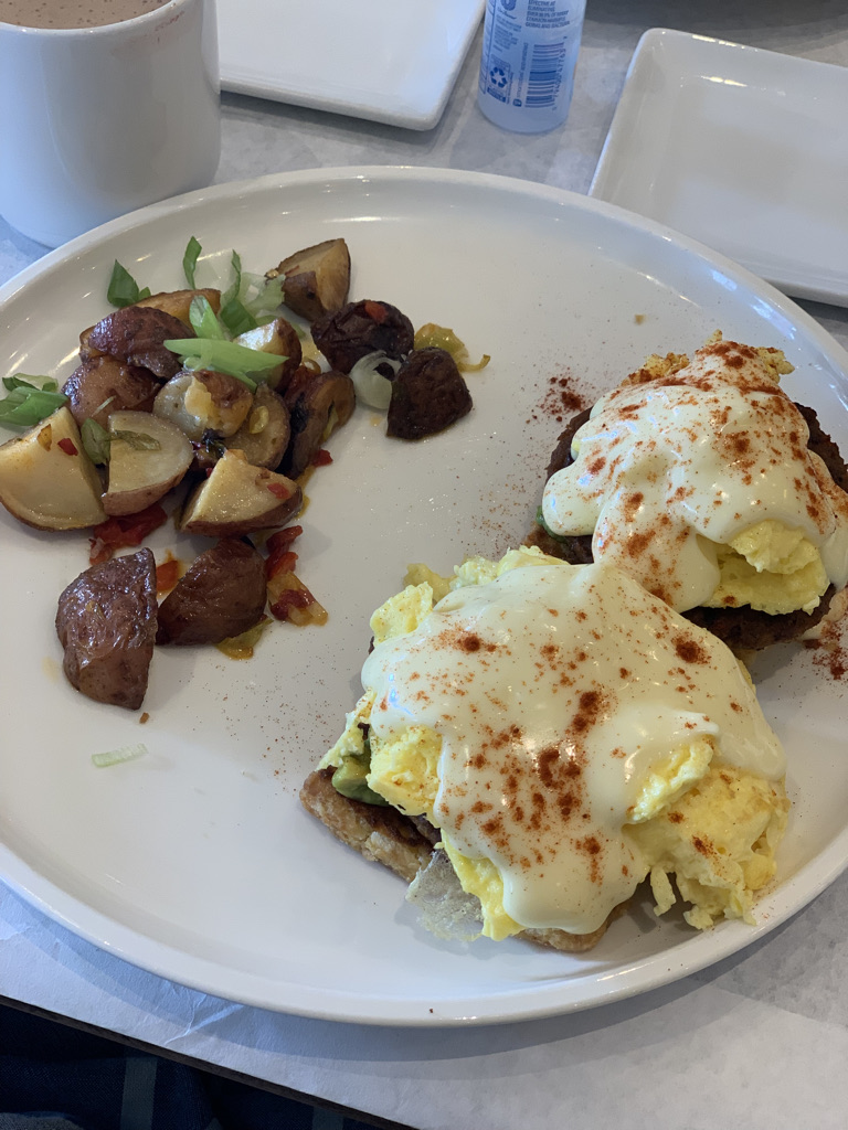 Food: We met up for brunch, and I did not eat; I was hungry and ready to order. The menu reminded me of Dutch and French St. Maarten. The European influences were genuinely present. I ordered the Chorizo Sausage Benedict (homemade biscuit, avocado, smoked paprika hollandaise) and a side of Brioche French Toast (honey mascarpone, banana, fresh strawberries). My two other friends ordered the Four Cheese and Bacon Omelet and Three Eggs Your Way, with a side of the Roasted Red Bliss Potatoes. Overall, my tummy was complete, and my heart was whole. That says it all!