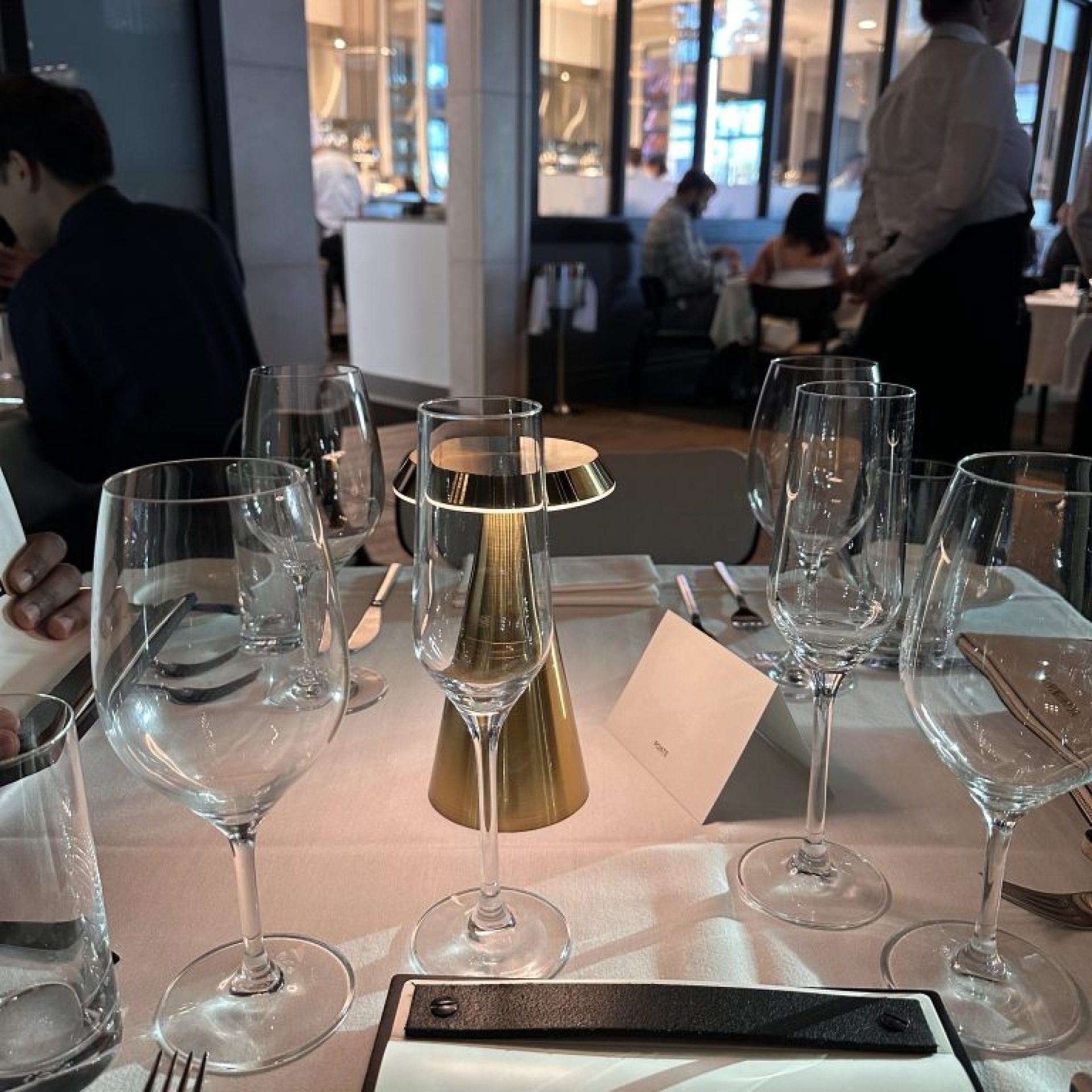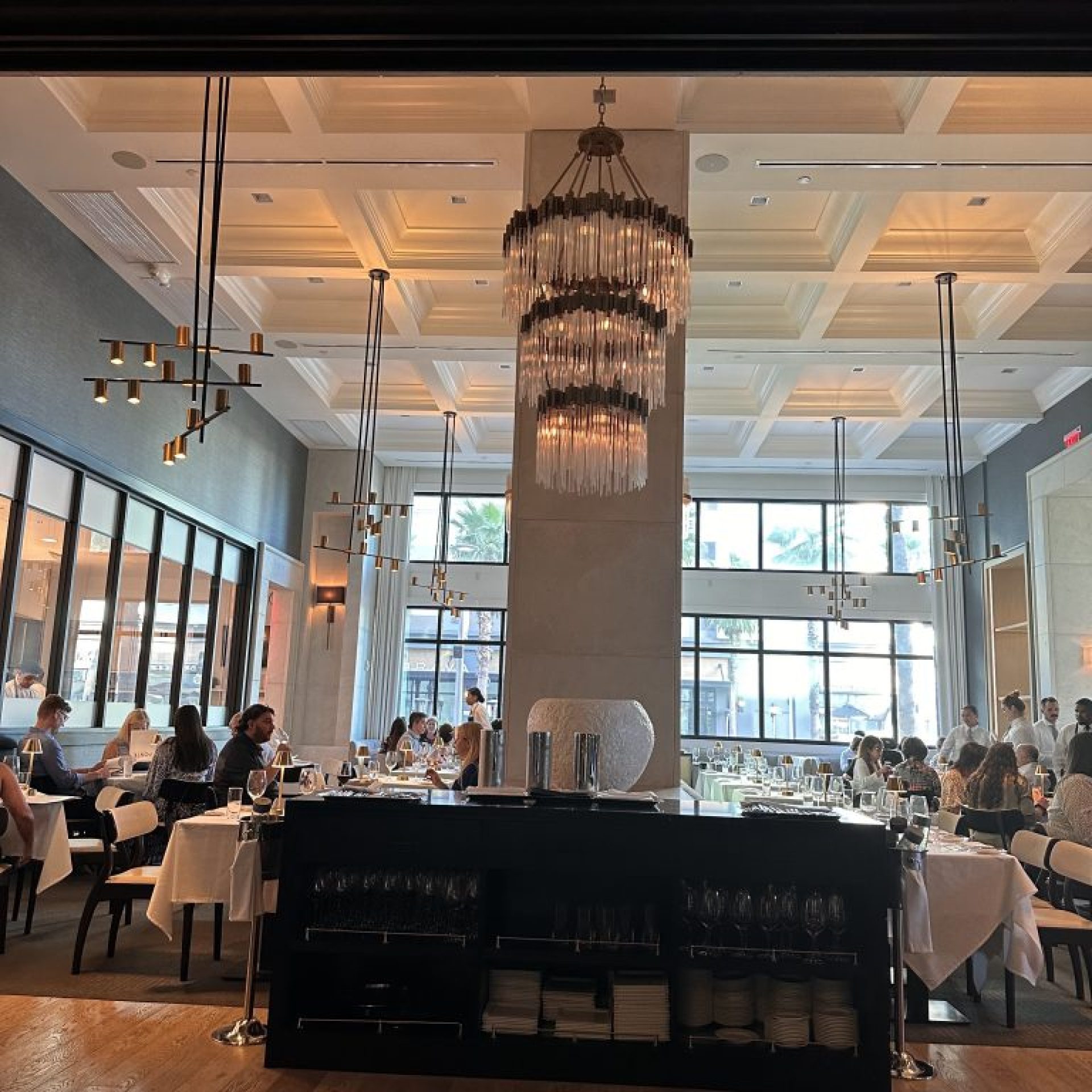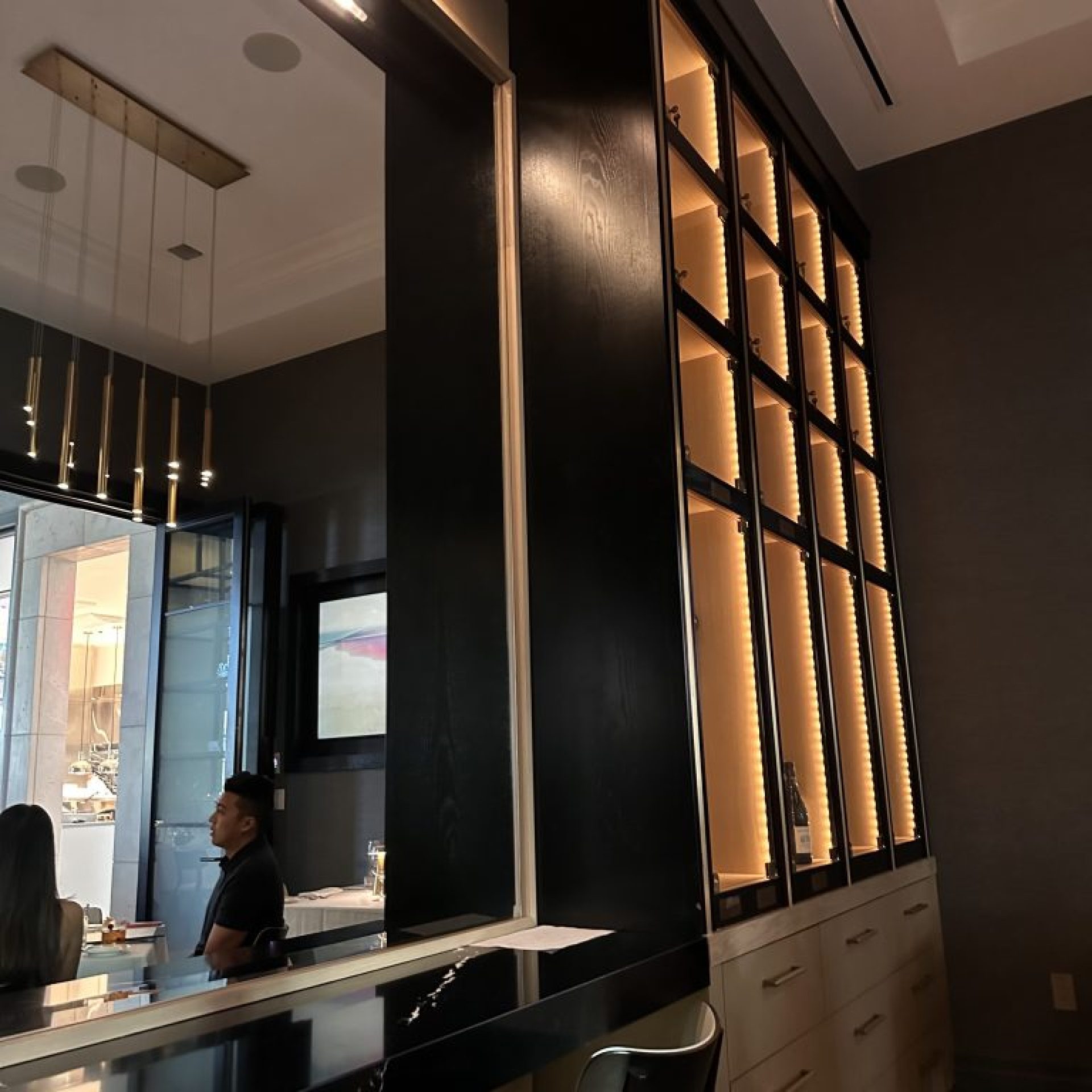 Ambience: This restaurant has modern dĂ©cor at its finest. You feel a sense of luxury and romance when you walk into the restaurant. The welcoming faces of the hosts to the service make it very inviting for a romantic evening or just an evening with some friends. The modern chandeliers made the lighting just right. The kitchen is visible to all, which is an added touch. I loved where we were seated. I observe that the middle section of the seating as compact.